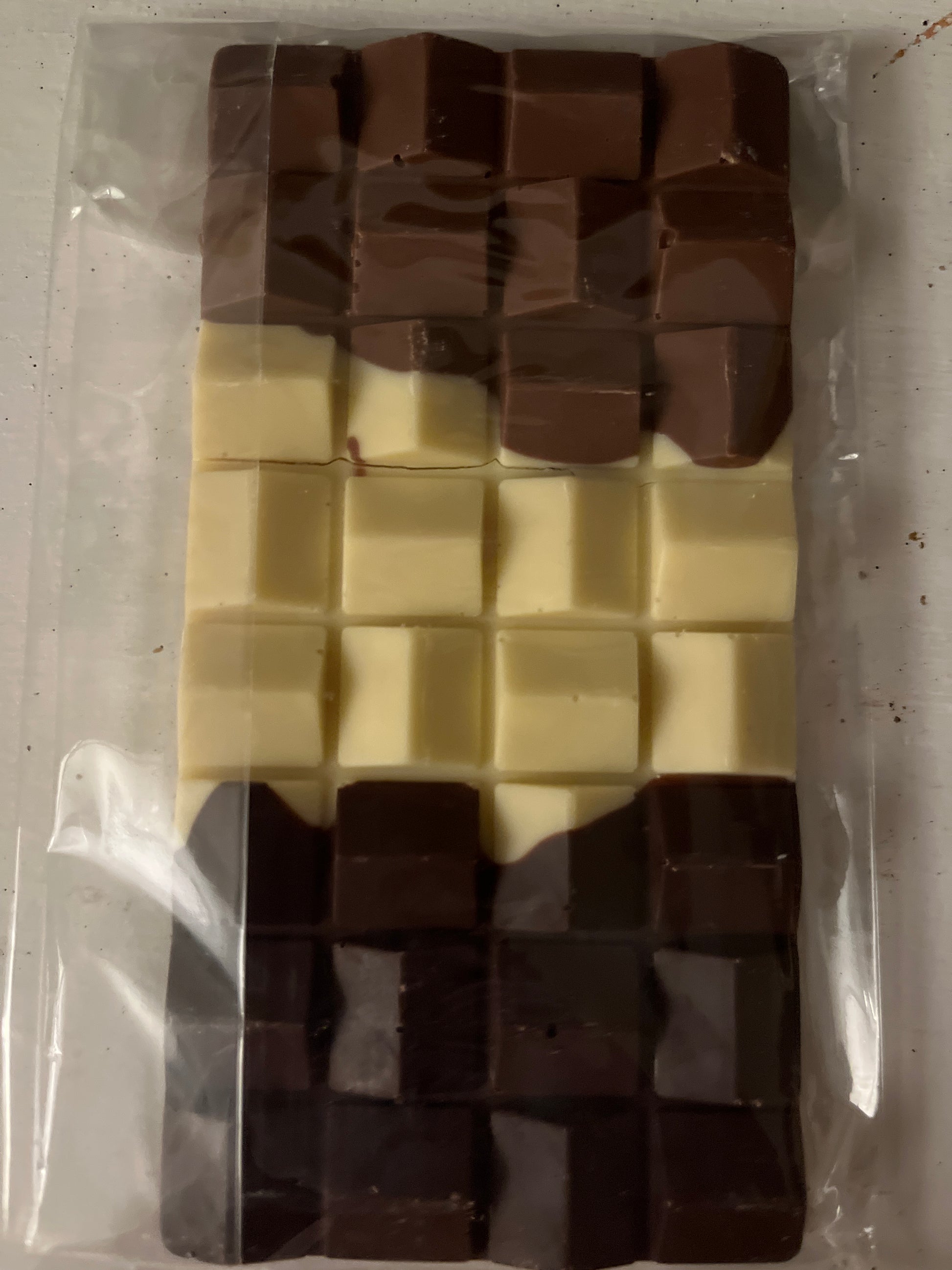 A special hand-made treat of our milk, white, and dark chocolate all in one bar. Comes in one of multiple designs.
